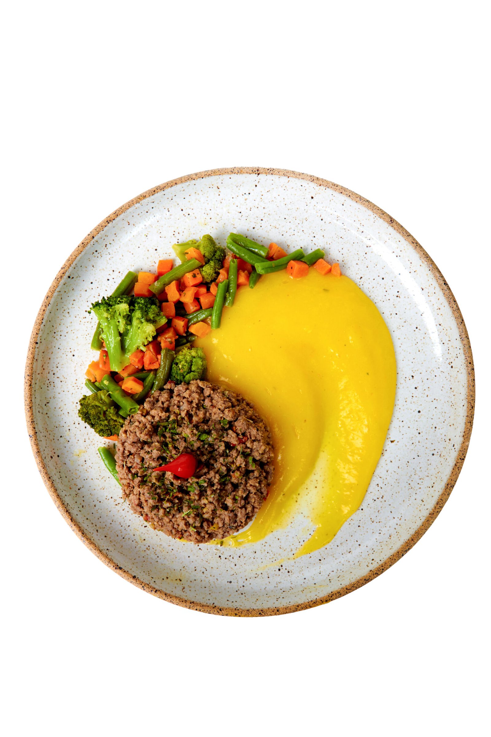 Carne moída (patinho), purê de mandioquinha e mix de legumes cozidos